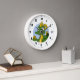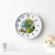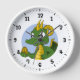 Horloge avec une illustration de la tête d'un petit dragon vert mignon tenant un oeuf d'or, design en cercle bleu, imaginaire mignon / conception de conte de fées pour les enfants par Maxiharmonie