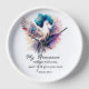 L'horloge murale chrétienne avec une citation inspirante Écriture représente une belle colombe blanche volant à travers le ciel, ses ailes ornées de éclats de peinture bleu et lavande. Il présente une Bible Verse Exode encourageante 33:14, "Ma Présence ira avec vous, et je vous donnerai du repos."