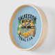 Élégante horloge murale avec une vignette de style rétro de la plage de Galveston, TX, front de mer. Disponible sur une variété de vêtements et d'accessoires.