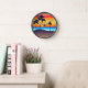 Horloge à l'image d'une île tropicale, aux palmiers, contre un coucher de soleil orange et un océan turquoise, avec des chiffres d'or