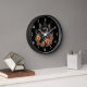 Une horloge avec une illustration mignonne. Un chat noir à poils longs portant un chapeau de sorcière noir. Ses oreilles dépassent. Entouré de fleurs d'automne orange et marron. Superbe design pour les objets sur le thème de la sorcellerie et Halloween.