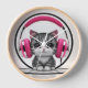 Un chat de style kawaii, à l'expression douce et aux grands yeux portant un casque rétro surdimensionné