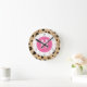 Horloge illustrant un cercle rose au centre. L'Arrière - plan est motif empreinte de léopard. Les chiffres sont roses et noirs. Personnalisez avec votre nom et votre initiale.