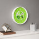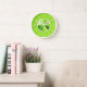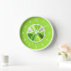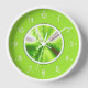 Cette horloge murale ronde présente de l'art fractal abstrait en vert sur un cadre rond blanc et un arrière - plan vert citron avec des chiffres blancs.