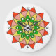 Mandala en rouge, rose, vert, jaune. Les diamants rouges et roses bordent le cercle extérieur. A l'intérieur sont des ovales vertes avec des points blancs sur une étoile jaune. Au centre se trouve une forme spirale blanche. Les numéros 12, 3, 6 et 9 sont situés sur un arrière - plan blanc entre les triangles rouges qui pointent vers l'extérieur.