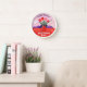 This unique, high-quality wall clock is vibrantly printed, protected by a high-impact plexiglass crystal face and features a pre-installed backside hanging slot for easy hanging and a non-ticking design.