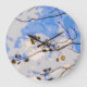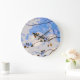 Les branches noires rigides se tiennent contre le feuillage jaune d'automne et un ciel bleu avec des formations intéressantes de nuage dans un motif abstrait sur cette horloge murale de beaux-arts.
