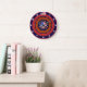 Parfait pour les amateurs d'Americana ! Doté d'un superbe logo central de carte des États-Unis entouré de treize étoiles d'or, d'élégants motifs d'or, et surmonté d'un texte en or des États-Unis. Autour de cela, des anneaux rouges et bleus encerclent avec des nombres blancs. A 12 heures, le drapeau américain est solidement assis. Une horloge élégante qui impressionne tous les fans des Etats-Unis d'Amérique. Entièrement personnalisable pour ajouter des noms, des images et plus encore. Bon appétit !