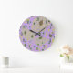 Cette horloge murale botanique est joyeuse dans son visage lavande avec décoration feuille
