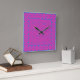 Une horloge murale carré élégante avec un motif lumineux de différents points rose et bleu sur un arrière - plan Magenta.