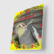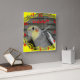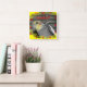 Une photo de clôture d'un Cockitiel brillant et coloré avec un arrière - plan gris qui est sur une CLOCHE DE MUR.