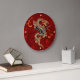 Horloge murale ronde élégante faite à l'arrière-plan décoratif rouge foncé, avec des graphiques d'un dragon chinois coloré, au milieu. Les parties scintillantes goldtone comme des points pour les nombres d'heure quarte, décorent le bord externe. Customisez pour ajouter le texte à cette horloge fraîche. Grand comme idée de cadeau à votre fan préférée d'imaginaire.