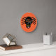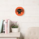 Cette horloge impressionnante présente une araignée noire éffrayante avec huit pattes poilues, des yeux jaunes avec de grands élèves noirs et sa bouche ouverte montrant ses crocs. Il y a un texte orange qui dit "Happy Halloween" et un arrière - plan orange correspondant.