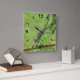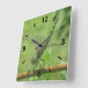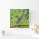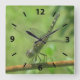 Cette horloge murale présente une libellule amicale posant pour sa photo.