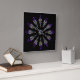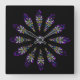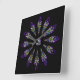 Un beau motif en verre souillé orne cette horloge murale dans des couleurs dominantes de pourpre, de bleu, de jaune et de noir. Douze plumes abstraites entourent un masque central pour former une conception spirituelle de mandala avec une sensibilité de Natif américain.