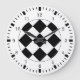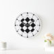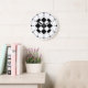Une horloge murale avec un thème de course de carrés noirs et blancs sur le visage, des chiffres noirs et les minutes marquées en noir. Cliquez sur Customiser pour modifier les couleurs des arrière - plans et plus encore.