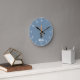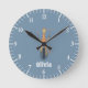 Une horloge murale bleue mignonne pour une chambre d'enfant ou une salle de classe préscolaire avec une girafe de dessin animé faisant du monocycle et faisant tourner des assiettes. Elle peut être personnalisée avec un nom.