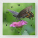 Cette horloge murale présente un papillon de couleur foncée reposant sur une zinnia rose.