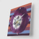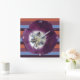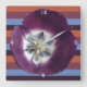 Fleur de tulipe violette en fleurs sur une horloge murale à fond rayé.