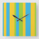 Une horloge murale chic et carré, avec une motif rayée audacieuse en bleu turquoise, vert feuille et jaune or. Une partie de la collection Posh & Painterly 'Daisy Chain'.