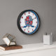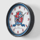Lettre monogramme de style Chevalier Un nom d'art simple horloge murale numérotée dans les tons rouge, jaune doré, bleu blanc et gris. Personnalisez avec le nom et le nom de votre enfant, ce qui signifie une touche personnalisée à la chambre ou à la garderie de votre enfant, cet exemple est pour les noms commençant par la lettre A. Il lit actuellement Archer Bowman Réponsif, pratique et fort. Idéal pour un cadeau à un nouveau bébé, pour un baptême, un nom de bébé ou un cadeau de baby shower. Dessin de bouclier unique, art graphique, recherche de nom, rédaction et design par Sarah Trett. www.sarahtrett.com pour www.mylittleeden.com