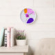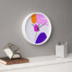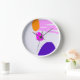 L'image centrale de cette horloge murale est constituée de trois points expressifs en orange, violet et fuchsia, accompagnés d'une séquence de rayures roses au sommet.