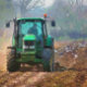 Préparation pour le next crop. The tractor plows (ploughs) the field and wild birds look for food in the freshly turned soil. Watercolor England.