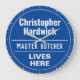 Amusant style Commémoratif Plaque murale Cadeau sous forme d'horloge murale pour un boucher maître. Plaque bleue et blanche. Modifiez la conception pour modifier le libellé en fonction du destinataire du cadeau.