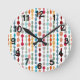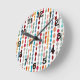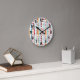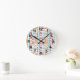 Cette horloge murale a un design moderne du milieu du siècle de cercles et ovales tendus ensemble dans des couleurs rétro entrecoupés sur un champ de blanc.