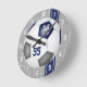 Cette équipe sportive colore l'horloge à thème du football pour une fille ou un garçon dispose d'un simple graphique de ballon de football sur lequel vous pouvez customiser le nom de l'athlète, monogramme et numéro de maillot - les panneaux noirs de la balle de football ont été recolorés bleu et gris - l'arrière - plan est personnalisable gris clair avec le graphique d'accent net de but dominant, bandes verticales bleu et chiffres de l'horloge blanc - par katz_d_zynes