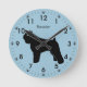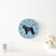 Magnifique silhouette noire d'un chien de berger Bouvier des Flandres. Chiffres et graduations d'horloge en noir avec de petites empreintes de pattes de chien à chaque nombre. Le fond est transparent pour que vous puissiez choisir une couleur qui correspond à votre décoration, nous avons choisi le bleu clair. Personnalisez le texte facilement avec vos propres informations.