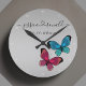 Magnifique horloge murale gris argenté connectée par l'amour célébrant un couple et leur amour. Personnalisée avec les noms du couple écrits en écriture cursive et reliés par un cœur tourbillonnant. Elle est en outre personnalisée avec une date personnalisée. Décorée d'une illustration adorable de deux papillons, un violet et un bleu. Cadeau tendance, moderne et élégant pour un couple qui aura à la fois une valeur pratique et décorative. Vous pouvez en faire un cadeau d'anniversaire, un cadeau de mariage ou un cadeau de fiançailles et oui, c'est parfaitement bien s'il s'agit d'un cadeau que vous vous offrez à vous-même et à votre partenaire pour célébrer votre belle connexion amoureuse.