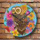 Chouette assise au milieu d'un bouquet de fleurs d'été colorées dans un décor bleu