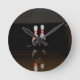 A clock featuring a picture of a bowling about to knock down two bowling pins for a spare.