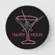 Made to look like a vintage bar sign, the retro design on this wall clock feobjets a neon pimento-stuffed olive on toothpick floating in a pink neon martini glass. With one word on each side of the glass stem, the phrase "HAPPY HOUR" is spelled out in the mes propres pink. The customizable text can easily be change d to say whatever you like or can be deleted altogether. From my original numally created image.