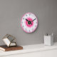 Décorate any wall in your home with a trendy way to keep track of time. Design with a beautiful pink and white flower graphic and classy clock face numbers for a ladies or girls menacom, bathroom, dorm room, or play room.