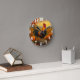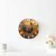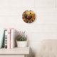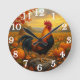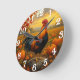 Rustic farmhouse clock features a vibrant rooster (red/orange/black feathers) standing proudly on rocks amid golden wheat fields and pumpkins, with red maple leaves. White numerals on warm sunset backdrop create cozy autumn charm—perfect for Thanksgiving decor.