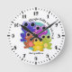 Mignonne horloge FROG, colorée, personnalisée, conçue avec une famille de grenouilles aux couleurs vives, dressée contre un cercle turquoise dans l'arrière - plan. Le texte incurvé se lit TOUJOURS ENTIÈREMENT SUR DIEU, qui est basé sur l'acronyme chrétien populaire pour F.R.O.G. Il y a un nom d'espace réservé personnalisable en bas, que vous pouvez personnaliser avec votre propre nom. Des éléments correspondants sont disponibles.