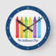 Un beau cadeau de la Semaine d'appréciation de l'enseignant ou de la fin de l'année pour un cours de jardin d'enfants à donner à leur enseignant de l'école primaire. Horloge faite sur mesure avec leur nom customisé en bleu. Personnalisez avec votre nom ou texte sous l'arc-en-ciel mignon des crayons. Un cadeau adorable pour un professeur de maternelle.