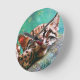 A clock with a cute painting with an adorable sleeping baby ocelot cub and a roman numeral clock face. Who can resist a cuddly looking kitty cat ?
