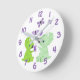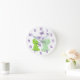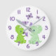 Les caractéristiques mignonnes de cette de bébé horloge de crèche deux petits dinosaures verts adorables de bébé observant les papillons pourpres montent. Les nombres pourpres assortis rendent l'horloge facile à lire. Tout est placé sur un arrière - plan blanc. Soyez sûr de voir les produits assortis de crèche et de bébé dans notre magasin.