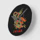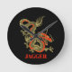 Un dragon chinois noir féroce surligné d'or décore cette horloge murale. Les accents rouges mettent en valeur la mâchoire, la tête et la colonne vertébrale du dragon. Votre nom est écrit en or en gras ci-dessous.
