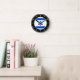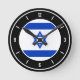 Drapeau d'Israël Horloge élégante ronde avec le drapeau d'Israël positionné au milieu et de jolis chiffres de montre blancs sur le bord de l'horloge. Un fond noir charmant avec des éléments ovales blancs finalise le design en mettant l'accent sur l'élégance. Une belle combinaison de noir et de blanc avec l'intégration habile des couleurs du drapeau national fait de cette horloge le cadeau parfait et la grande pièce à exposer sur le mur. © 2022 CountriesOfTheWorld