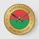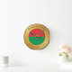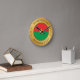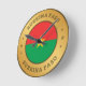 Le drapeau burkinabé est encastré dans un faux anneau d'or arrondi. Les mots "Burkina Faso" se trouvent en haut et en bas de la conception et ont un effet pressé. La paire de trois étoiles décoratives les unes en face des autres, est également conçue avec un effet pressé.