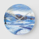 Peinture d'un glacé sur la route en hiver avec de la neige tout autour et une grange rouge au loin.