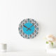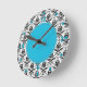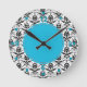 Lovely decorator wall clock done in a black and white damask . A turquoise round scalloped edge circle, in the middle, and turquoise numbers, aroet the outside, give a pretty ful accent. Customize to add text to this elegant clock. Great for any room of the house or office.