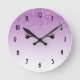 Une horloge au design design design et tendance. L'arrière - plan est une couleur de dégradé violet avec une parties scintillant étincelante qui descend du haut. Une paire de cils mignons ceinturés sous la parties scintillant.