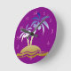Horloges murales customisées qui comportent une conception de 2 palmiers sur une île avec un arrière - plan pourpre. Ceux-ci échouent les horloges orientées seraient parfaits pour votre maison de plage, bureau, affaires de plage, ou patio.