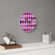 Cette horloge murale a un design art déco de formes en diamant fait d'angles superposés en lignes noires colorées dans les tons violet et rose avec des lignes noires en diagonale donnant l'apparence d'un Jacquard
