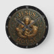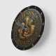 This round wall clock features a beautiful embossed, metallic-look depiction of the Holy Family: Jesus, Mary, and Joseph, embraced together with a baby. Ornate crosses and decorative scrolls adorn the background. "JESUS HOUSE" is prominently displayed at the top and bottom. This spiritual clock is perfect for fostering a sense of faith in your home.